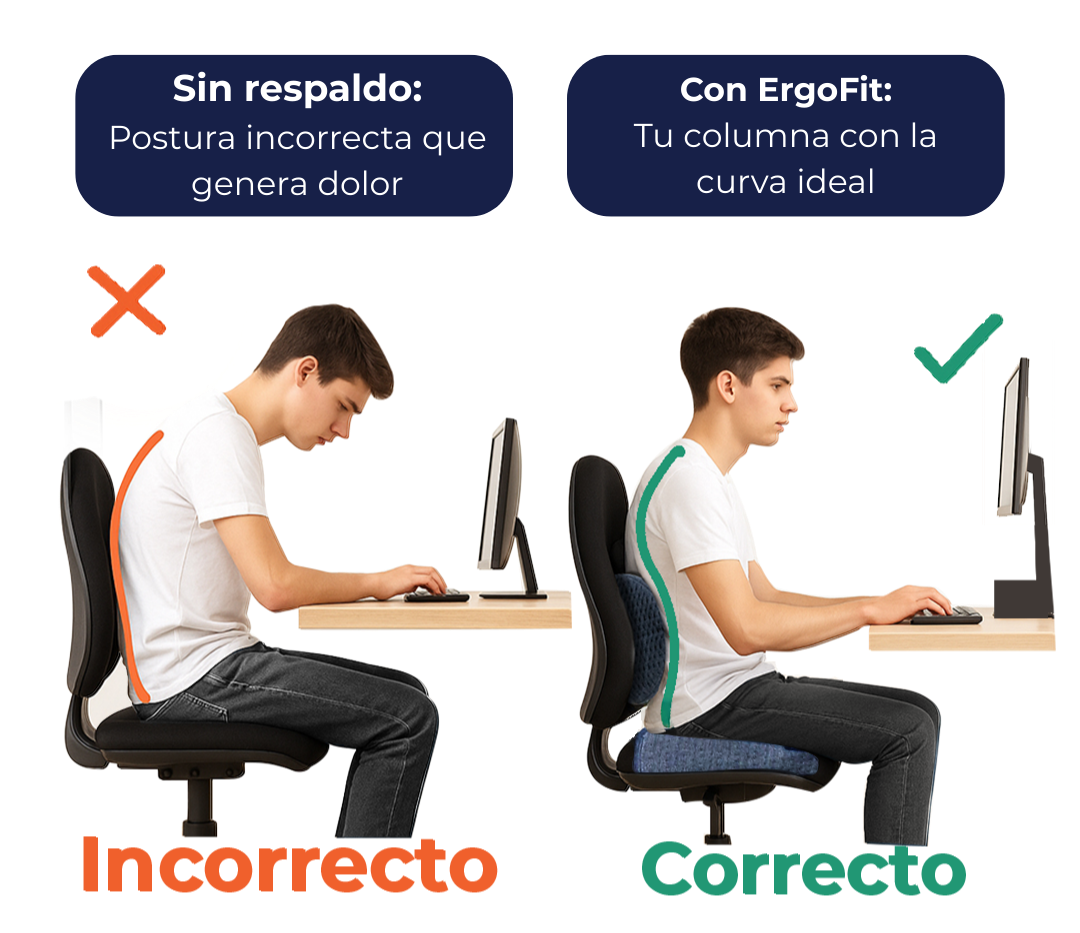 Pasar horas sentado sin un respaldo adecuado genera una curva incorrecta en tu columna, aumentando la presión en los discos y provocando dolor.